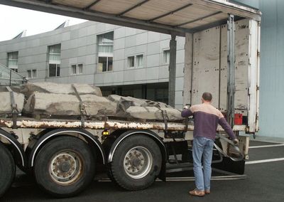 Sur les soixante et quelques carrières contactées, celle de M. Persiani, à Bort les Orgues, est la seule qui offrait des blocs de bonne taille, l'extraction se faisant à la pelleteuse. Les colonnes ne sont pas de ces parfaits hexagones comme ceux qui constituent les murs de soutennement des "ouvrages d'art" de la région (ci-dessous) mais après tout, ![]() les colonnes de Beuys à Documenta n'en étaient pas non plus... (voir ici).
