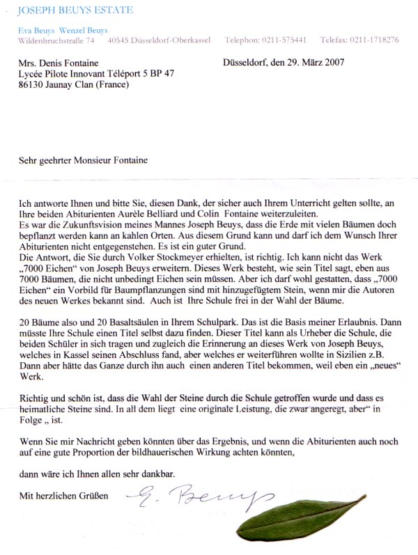 - à New-York, vingt trois colonnes plantées en deux fois ; cinq en 1988 (Chelsea area) puis dix huit en 1996, dans la 22ème rue, entre la 10ème et la 11ème avenue, - à Minneapolis (Minnesota), une colonne et un cotonnier sont plantés en 1997 par un groupe d'étudiants du St Paul Central High School (en parallèle à la plantation par le Walker Art Center de 1031 arbres -environ un par habitant- à Cass Lake, au nord de l'état) - à Oslo, une implantation au KHIO (Oslo National Académie of Art) - en Australie, à l'occasion de la cinquième biennale de Sydney on y fait référence aussi au Jocelyn Art Museum d'Omaha (Nebraska), au Teed Museum de Duluth (Minnesota encore) et au Benedicta Arts Center (Minnesota toujours !), mais on ne trouve pas davantage d'informations... Les élèves d'arts plastiques ont donc souhaité prolonger la pensée de Beuys en plantant une colonne et un chêne, mais les circonstances particulières du vingtième anniversaire du lycée, du parc du Futuroscope et de toute la technopole ont fait croître le projet jusqu'à 20 colonnes et 20 chênes. Il fallait demander aux dirigeants de Documenta ce qu'ils en pensaient, ce fut fait par mail, grâce à la traduction de Moris (élève plasticien-germaniste) (pièce jointe). La réponse était encourageante, et suggérait d'en parler à Madame Eva Beuys, veuve de Joseph ; ce fut fait par lettre, encore merci Moris (pièce jointe bientôt). Toutefois, le professeur se permit d'y joindre son mot, merci à Carmen Diaz et Karsten Schinkel pour les deux traductions (pièces jointes). La réponse de Madame Beuys fut un feu vert, vert comme le projet de son artiste de mari et comme la feuille d'olivier qui accompagnait sa lettre (pièce jointe).