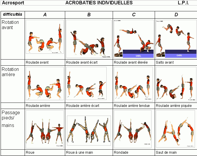 | Construit un code de référence | identifier et placer ses propres figures dans le cadre proposé par le prof en fonction du nombre d’appui avec le sol, avec le porteur, des renversements, de l’éloignement du centre de gravité |