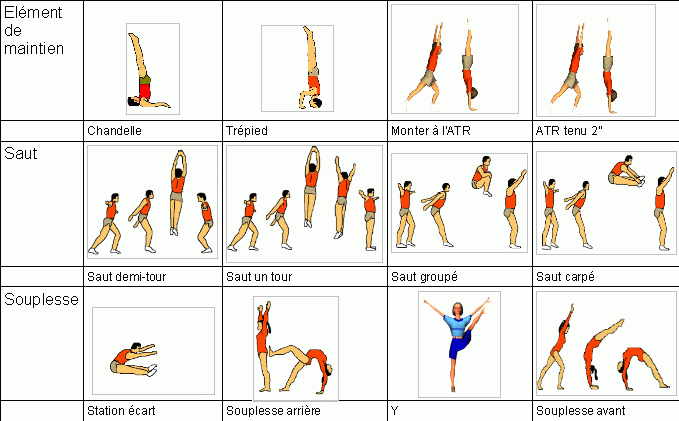 utilise des éléments gymniques simples et variés pour faire des liaisons entre les figures collectives conçoit et réalise de façon équilibrée des figures statiques ou dynamiques avec des montages et démontages simples : recherche l’alignement segmentaire varie les leviers utilise des paliers intermédiaires se synchronise avec ses partenaires dans le temps et l’espace assure la continuité de l’enchaînement |