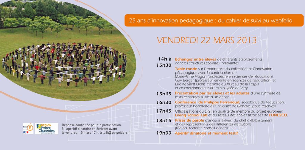 Le 22 mars après-midi s’est déroulé le 4ème et ultime épisode de notre anniversaire des 25 ans du lycée pilote innovant international ; 25 ans d’innovations pédagogiques ; du cahier de suivi au webfolio. Élèves, anciens élèves, parents d’élèves, membres de la communauté éducative et invités extérieurs y étaient conviés.