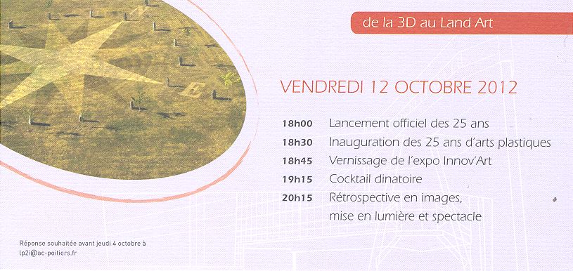 Le lancement officiel, à 18h, était couplé avec l’inauguration à 18h30 du premier événement de l’année, les 25 ans d’Arts Plastiques. Dans ce cadre une exposition des oeuvres des Lpiens d’hier et d’aujourd’hui était présentée dans les couloirs du 1er étage. Ce fut également l’occasion d’inaugurer un panneau de présentation des « 4 vents », projet Land art, d’arts plastiques présent à l’arrière du lycée.