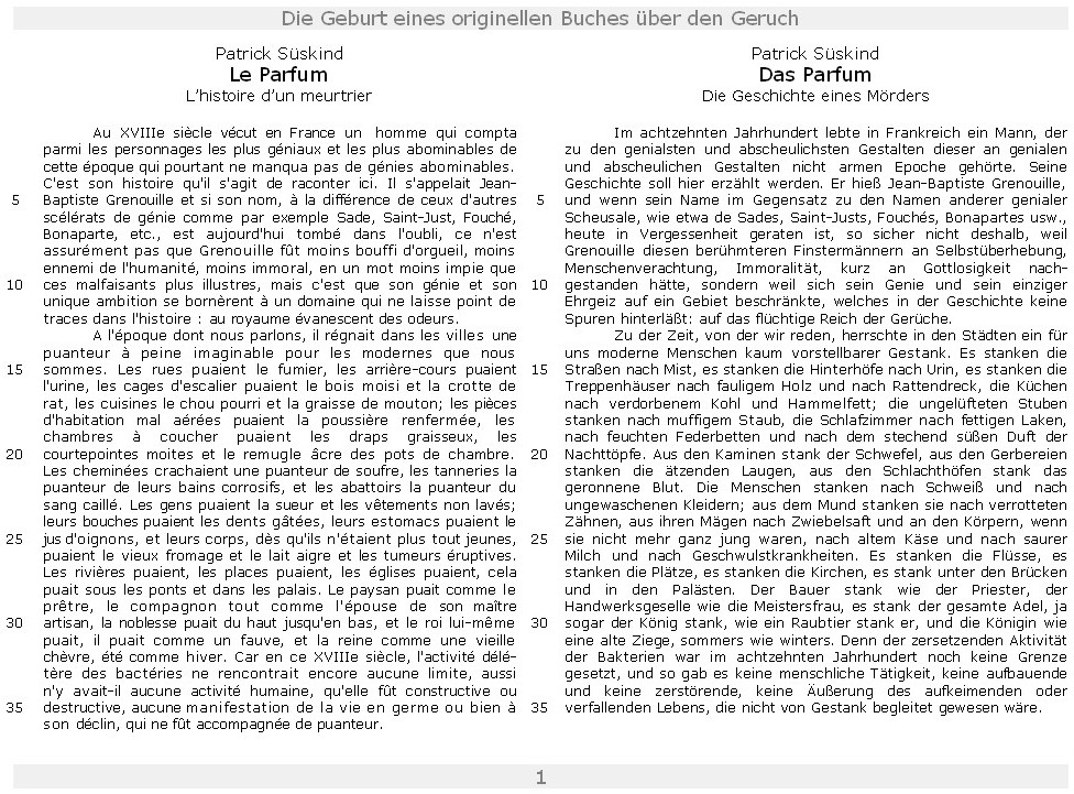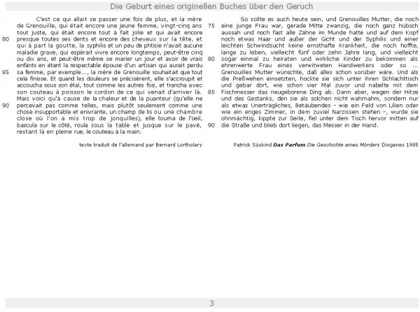 Haben Sie schon Das Parfum gesehen oder gelesen ? Wie wärs denn mit einer Wiederentdeckung des Originals ? Hier finden Sie den übelriechenden Anfang im deutschen Urtext und in französischer Übersetzung.