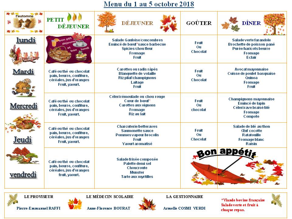 Menu du 1 au 5 octobre 2018