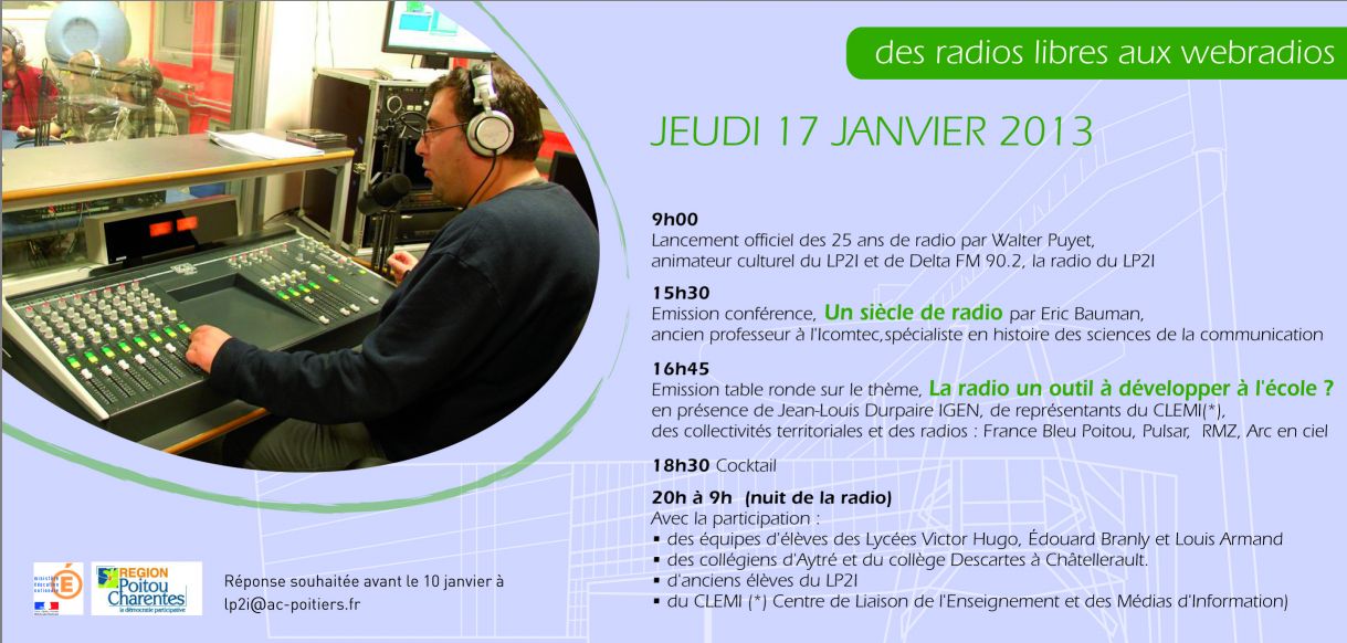 - 16 h 45 : émission / plateau / table ronde La radio un outil à développer à l’école ? en présence de JL Durpaire IGEN, Gérard Colavecchio, Anne de Bois, Éric Bonneau, Pascal Carré directeur de Radio Bleu Poitou, Pulsar, Arc en ciel, Radio Gâtine, RMZ, des représentants des collectivités territoriales, Laurent Cardona, des élèves du lycée dont ceux de l’ACF On Air, des élèves d’autres établissements et d’anciens élèves du LP2I