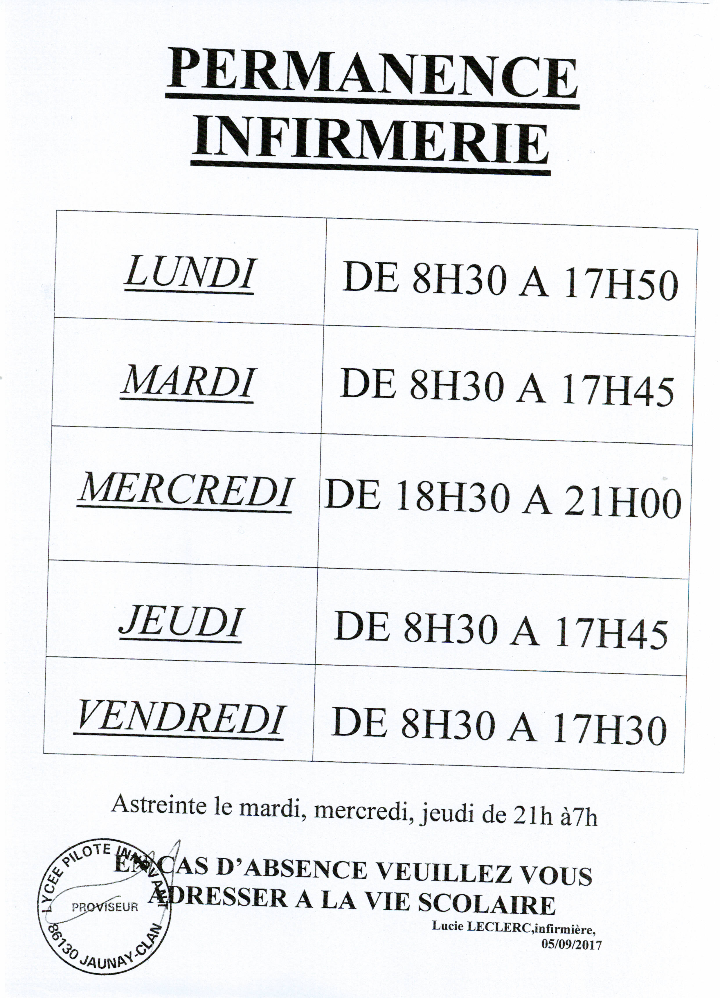 Mme LECLERC Lucie : infirmière de l’éducation nationale, présente tous les jours aux horaires d’ouverture de l’infirmerie.